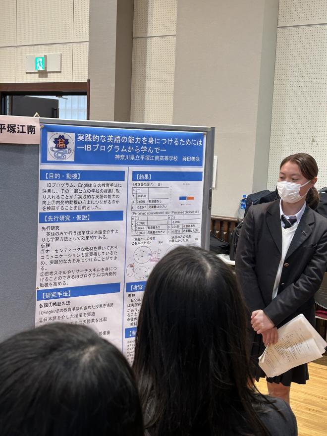 この成果発表会は「共創探究Ⅱ」の授業の一環で3年生が約1年半かけて研究してきた論文の発表会でした。SSHが平塚江南高校で始まってから2年半、中間発表が行われた昨年度3月と比べるとより深みのある発表をしてくれました。