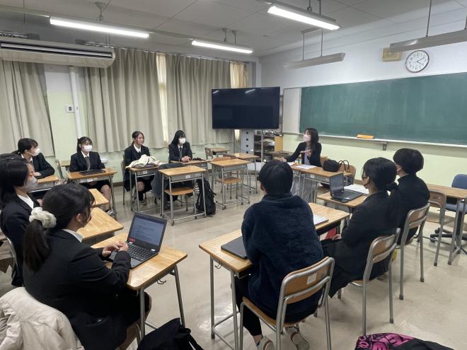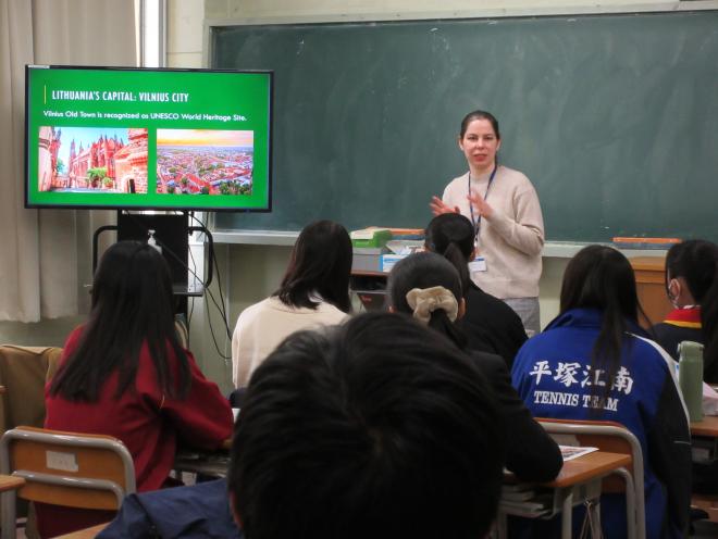 「人文・社会②」のグループでは、平塚市との交流が行われている「リトアニア(カウナス市)と日本(平塚)の文化比較」を探究テーマとしており、11月12日(水)平塚市国際交流員のゲセヴィチュ・ヴィクトリヤさんをお招きしました。生徒はリトアニアについての講義を聞いたり、質問をしたりして、リトアニアの文化について理解を深めました。
