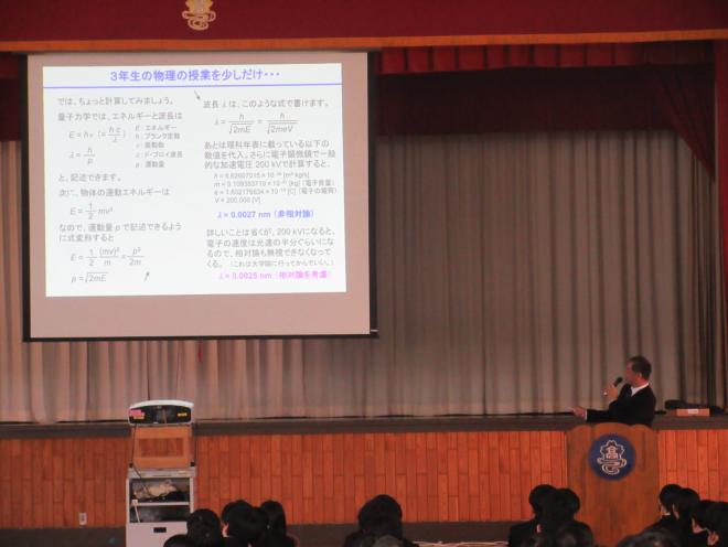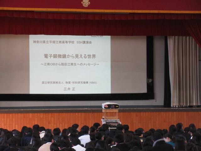 令和7年1月8日(水)の午後からSSH講演会を開催し、茨城県つくば市にある「物質・材料研究機構(NIMS)」研究員の三井 正 氏(OB)に講演いただきました。テーマは「電子顕微鏡から見える世界~江南OBから現役江南生へのメッセージ~」で、自身の高校時代から現在、電子顕微鏡の進化、AIが研究に係わってきている話をしていただきました。