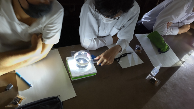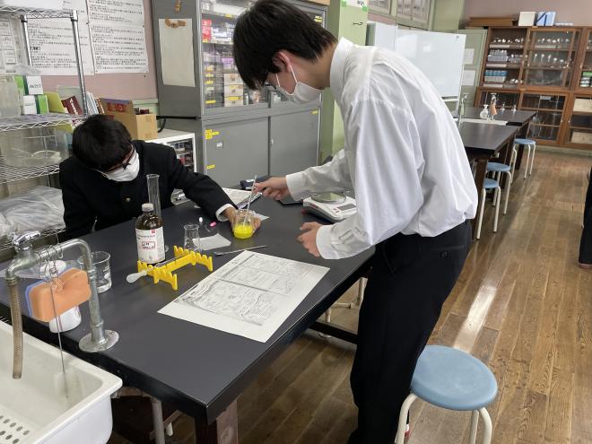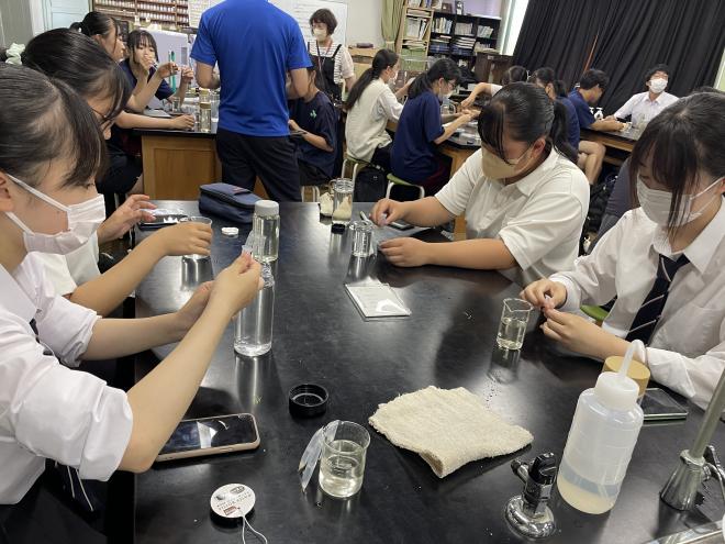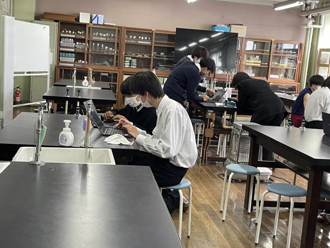 論文や書籍を輪読しながら、研究手法の学習として、実験してデータを出し、グラフ化、考察の練習も行います。実験結果はchromebookでデータを共有し、結果から課題の答えを導いていきます。以下の写真は、チョーク中の不純物質の割合を調べています。