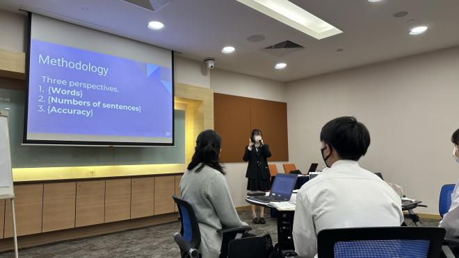 「シングリッシュ(シンガポールで使われている英語)は英語の方言なのか、他言語なのか」についてオールイングリッシュで議論をしました。授業後は大学生から自身の研究のアドバイスをいただき、非常に有意義な時間になりました。