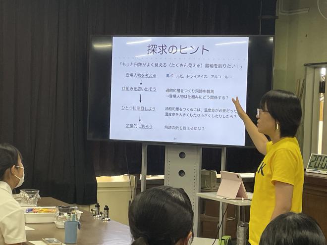 当日は実験実習内容を英語で行ったあと、KEKキャラバン講師によるKEKの概要説明と御本人の進路、キャリアについてお話しいただきました。