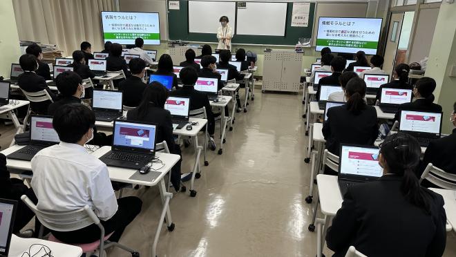 また、1年生の「共創探究基礎」は「情報Ⅰ」と「総合的な探究の時間」を融合させた科目です。これからの情報社会のなかでの情報モラルや学習端末の使い方など様々なことを学んでいます。