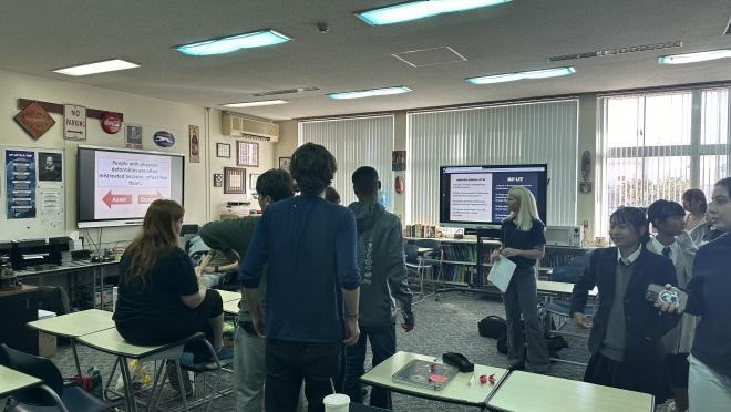 Kinnick High Schoolではバディと一緒に行動をします。物理やコンピュータデザイン、スペイン語、調理などの多様な授業を英語で受けました。進路について考える授業やバディと一緒にコミュニケーションを図りながら競い合う授業もあり、生徒は一生懸命で、かつ楽しそうに過ごしていました。