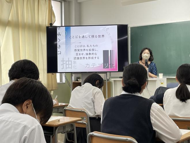 今回は本校卒業生でもある、今井むつみ先生(慶応義塾大学環境情報学部教授)をお招きし、「ことばを通して視る世界~ことばは思考にどのような影響を与えるのか~」というタイトルで、ご講演いただきました。講演会は、本校の教室からオンライン同時配信の形式をとり、一部の希望生徒が対面で聴講しました。