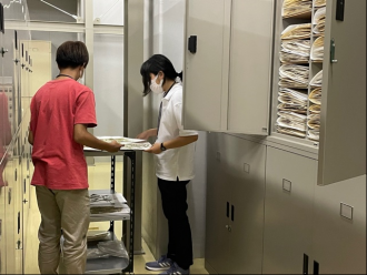 分類された標本を収蔵庫に格納する本校生徒