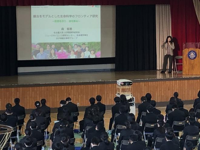 11月13日金曜日の午後、本校卒業生でもある名古屋大学の森郁恵教授による講演会が、1年生を対象に実施されました。「線虫をモデルとした生命科学のフロンティア研究~前例を作り、道を創る~」をテーマに、SSH1期生である1年生に向けて、ご自身の専門の内容や、研究者にに必要な力についてお話しいただきました。生徒は熱心にメモを取り、活発な質疑応答も見られ、大変有意義な講演でした。