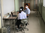 (画像右:作ったスライドについて、廊下で先生に助言をもらい、ブラッシュアップします。)