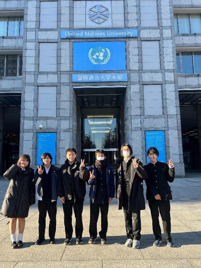 令和7年1月9日(木)、2年生(78回生)共創探究Ⅰの校外学習として、国際連合大学(東京都渋谷区)で行われたシンポジウムに参加しました。参加したのは「世界を読み解くゼミ」「第二言語習得ゼミ」のメンバー6名です。