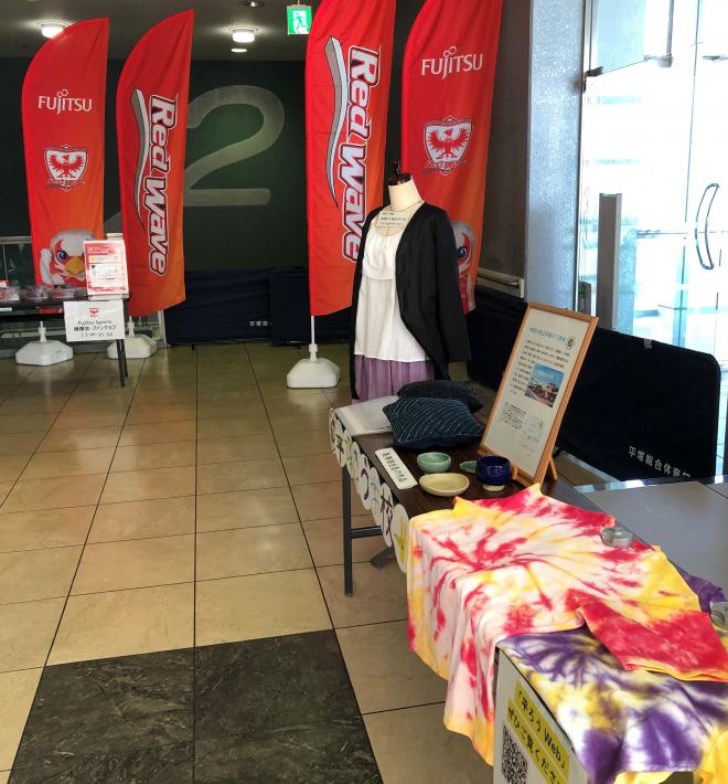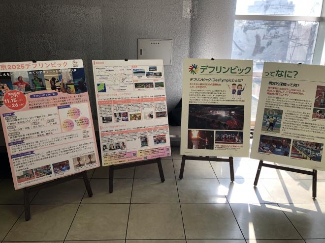 1月18日(土)トッケイセキュリティ平塚総合体育館で開催された女子バスケWリーグの試合会場に、神奈川県スポーツ課のデフリンピックPRブースが出展されました。平塚ろう学校も、デフリンピックで実施される競技の手話を生徒が紹介する動画の上映と授業で作った作品の展示を行いました。スタンドの出入り口に展示され、バスケ観戦に来た多くのお客さんに見ていただきました。