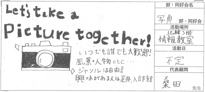 目標は関東地区高等学校写真展、全国高等学校総合文化祭、写真甲子園への出場です。