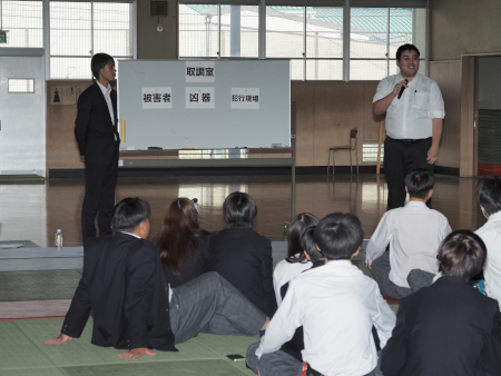犯人役が武道場から離れている間に生徒と警察官役で事件の設定をします。