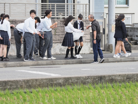 火ばさみとポリ袋を手に学校から四方に分かれます。