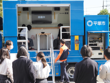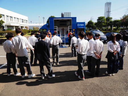 2年次では理科の「生物基礎」の授業を全員が履修し、「物理基礎」と「地学基礎」のどちらかを履修します。今週の「地学基礎」の授業では、平塚市災害対策課の方にお越しいただき、起震車による地震体験を行いました。