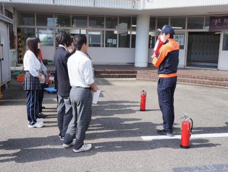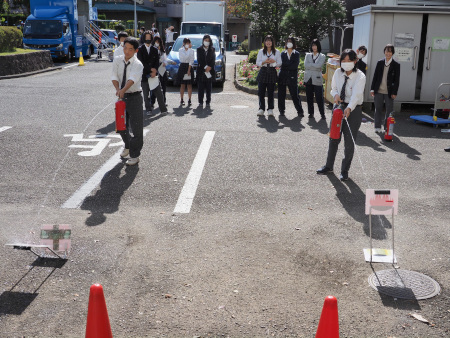 また、火災の初期消火訓練も行いました。初めに水消火器の説明を受けます。15秒間水を噴射することができます。