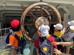 みなとみらいに降り注ぐ強い日差しを浴びながら、日本丸メモリアルパークへ行ってきました。船内では教員と手をつなぎ、様々な部屋を見学しました。船の操縦室では、舵を触ることができて貴重な体験となりました。昼食は、横浜ワールドポーターズ内にあるレストランでビュッフェ体験をしました。食べ始める前から笑顔を見せる子どももいて、楽しみにしていた様子が伺えました!「からあげ」や「ピザ」「うどん」など、それぞれが選んだメニューをおいしく食べることができました。