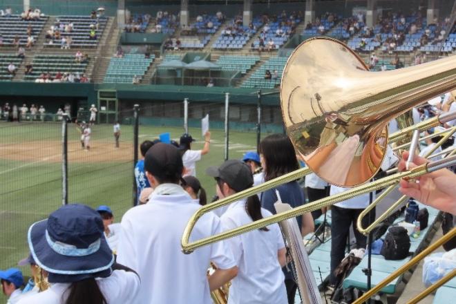 相模原中等教育学校を相手に、一般生徒や吹奏楽部、野球部保護者会、OBOGが、ベンチから熱い応援を送りました。