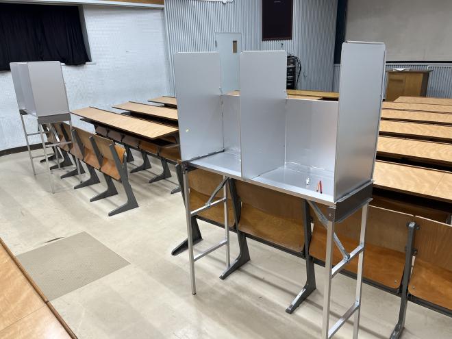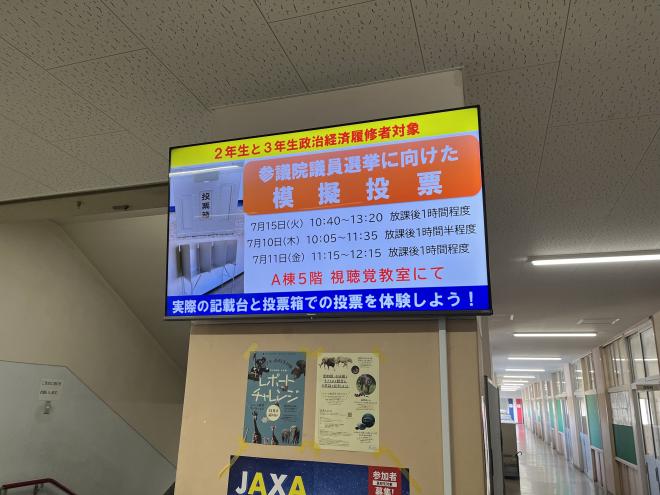 生田高校では、10日(木)と11日(金)に期日前模擬投票を、15日(火)に模擬投票本番を実施します。校内のデジタルサイネージやポスター等で周知しています。今回、多摩区選挙管理委員会から本物の投票箱と記載台をお借りし、地歴公民科の教員全員で投票会場を設営しました。多くの生徒が校内模擬投票での経験を通して、選挙や政治の意義について理解を深め、興味・関心が高まる契機となることを期待しています。