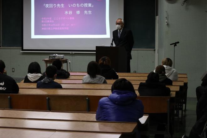令和2年12月14日、本校視聴覚室において、「夜回り先生」こと水谷修先生の「いのちの授業」講演会が開催されました。先生ご自身の貴重な体験や、愛する生徒に係る悲しいエピソードなどについて、お話しいただきました。「いのちとは何か」「生きるとは何か」ということを深く考えさせられる内容でした。生徒も皆、真剣に聞き入っていました。