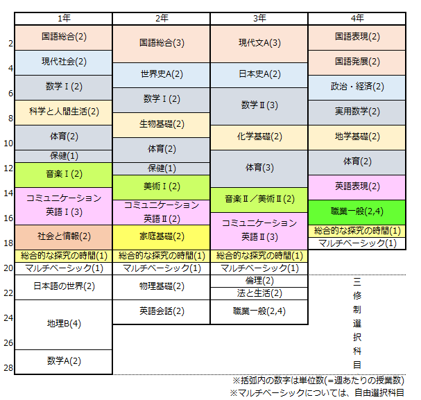 :0校時は学び直しを目的にしたマルチベーシックまたは、三修制(3年間で卒業)を選択した生徒のみ受講します。