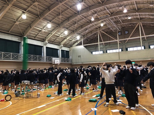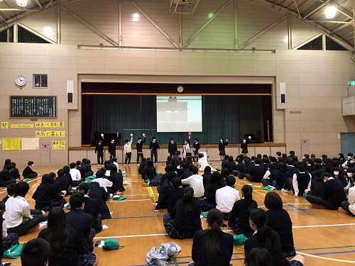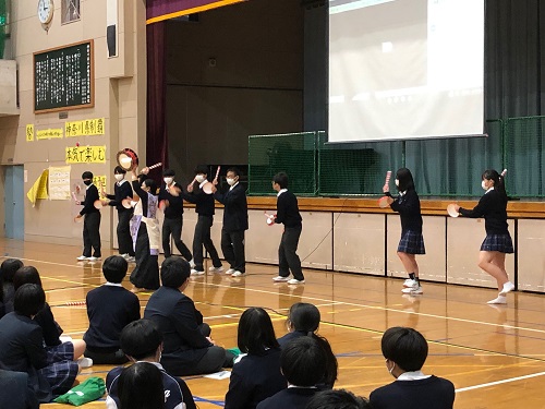 クラスの代表者が沖縄の伝統的な踊りであるエイサーを体験しました。
