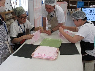 シミや破れ具合などの判別やおしぼりのまとめ方など、一つずつ確認しながら作業を進めていました。