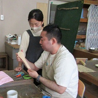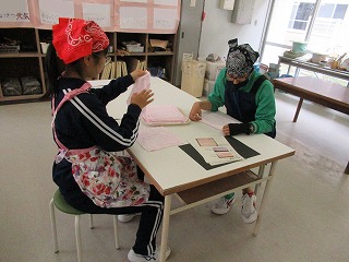 介護等体験で作業班に参加している大学生に見せたり、先生に確認してもらったりしながら、丁寧に取組みました。