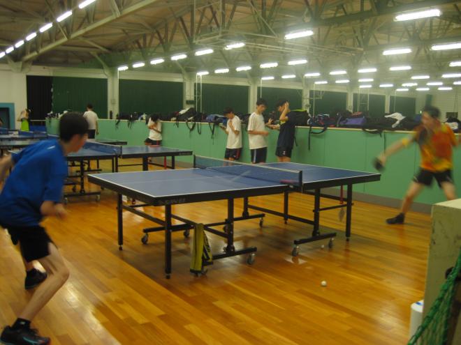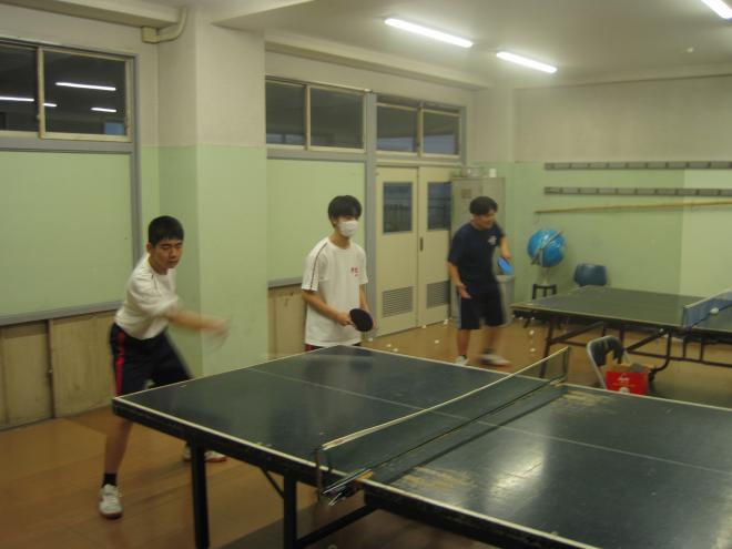 現在、男子15名、女子4名で活動しています。体育館の中二階にある卓球場で練習しています。
