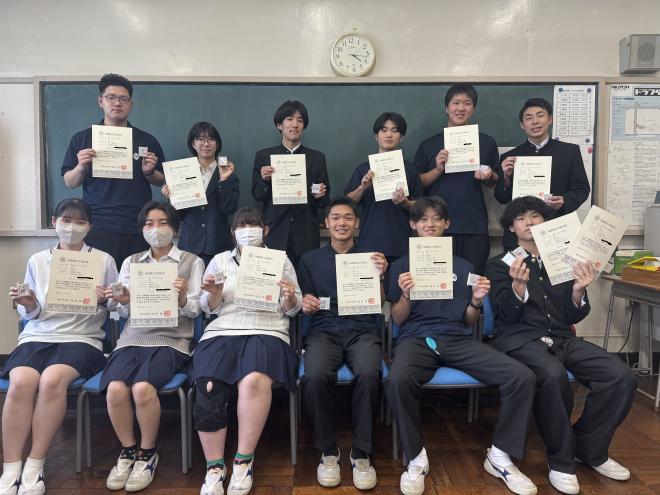 今年の初めに国家検定の技能検定(建築大工・鉄筋施工)に挑戦し、実技・学科共に合格した者が合格証を手にしました。今回は職員・3月に卒業した生徒を含めると16名が合格し、合格率は約7割でした。4名の女子生徒も受検し、合格しています!これからも知識のみならず技術・技能を習得できるように頑張ります!