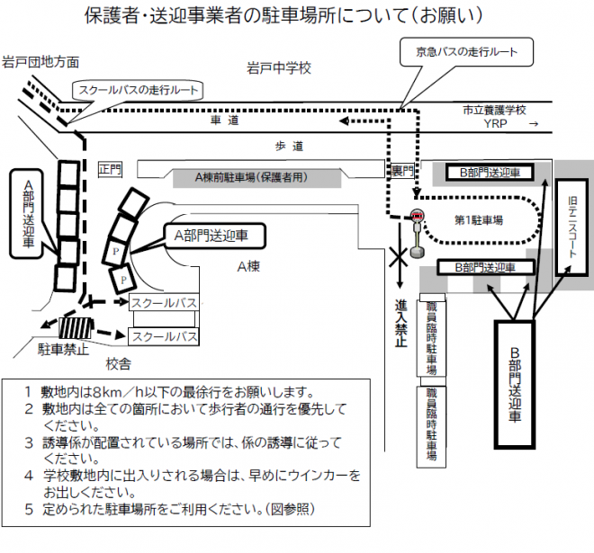 本校では、生徒の安全確保と路線バス・スクールバスの円滑な運行のために、保護者・送迎事業者の方が送迎や面談等で来校される際の駐車場所を指定しております。生徒の安全な登下校、バス運行のためご協力をお願いします。