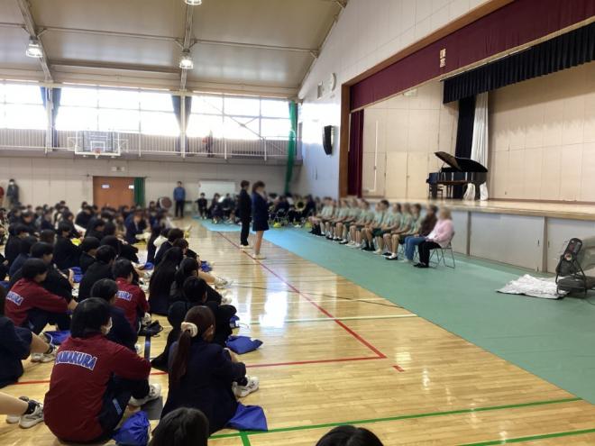 歓迎式典Welcome Assemblyで両校が挨拶をし、校歌紹介や記念品(鎌倉彫)の贈呈等を行い、各クラスに迎えられて鎌倉高校での生活がスタートしました。