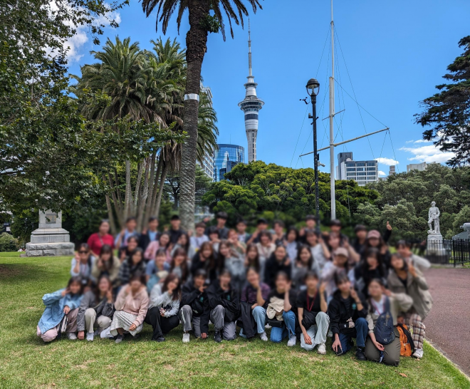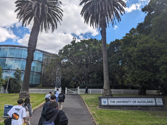 朝、ホストファミリーに名残りを惜しみつつ別れ、オークランドに移動しました。オークランド大学を現地の学生に案内してもらいながら見学しました。留学生も多く、広く充実したキャンパスに海外留学への夢が膨らんだことでしょう。