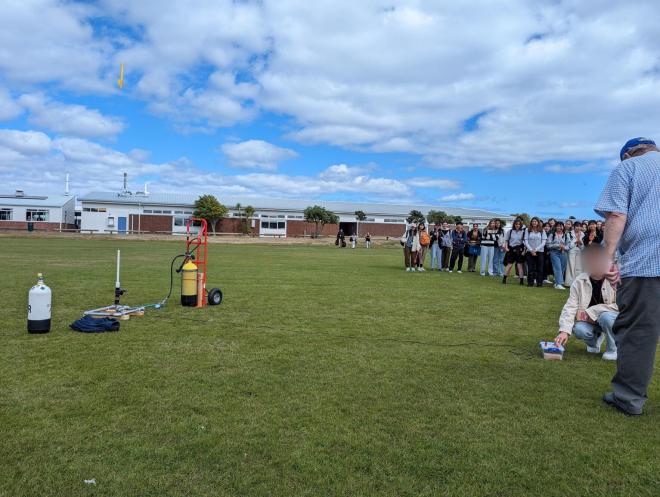 午前中はバディとの授業参加や昨日の続きであるエアーロケット作りを行い、広いグラウンドで実験も行いました。