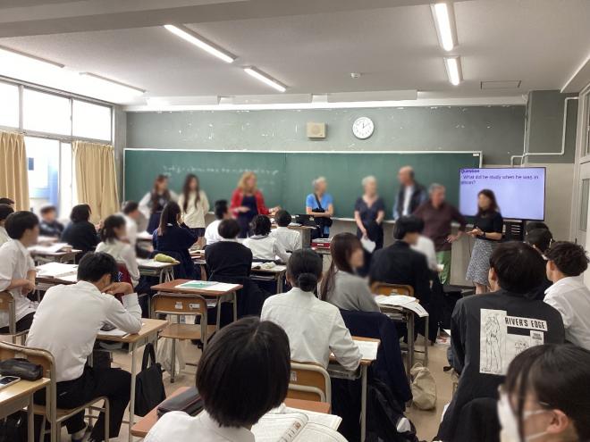 ナッシュビル市長夫妻や市議を含む30名程度の使節団で、将来の交換留学制度実現に向けて日本とアメリカ合衆国の教育現場の違いを理解するために視察に訪れました。国際交流委員が学校を案内し、授業の様子を見学しました。