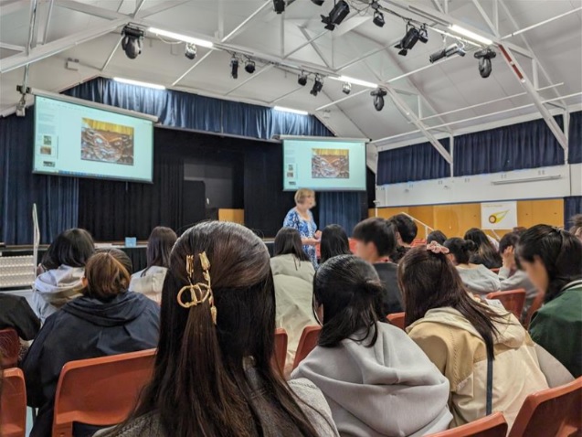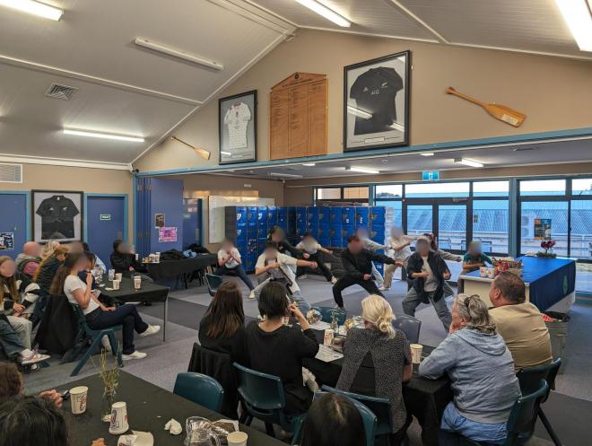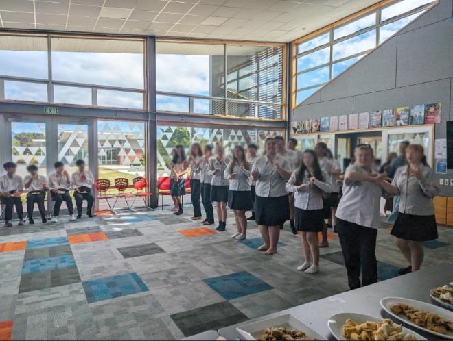 今日はマオリの伝統的な歓迎式がありました。ハカや歌を披露してくれて、こちらも校歌を歌ったり、プレゼントを渡したりして、最後は軽食をとりながら交流を深めました。