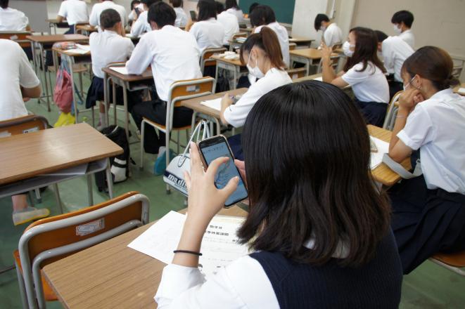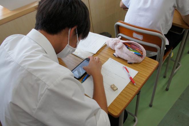 新型コロナウィルス感染防止の為、今回はグループ討議はおこなわず、各生徒がスマートフォンを活用し、Googleフォームで津波・洪水・土砂災害ハザードマップを見て避難経路の確認等をおこなったり、被害が及ぶ場所の推測などをおこないました。