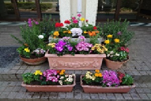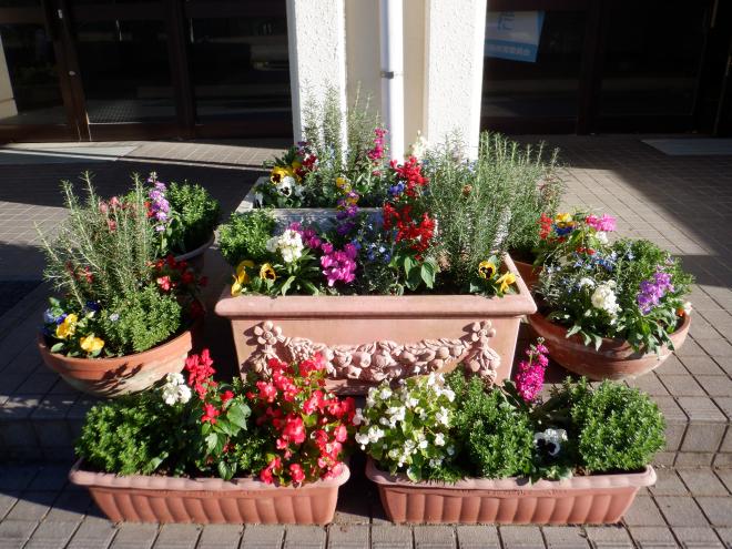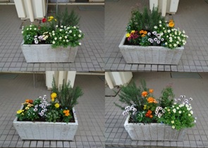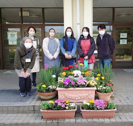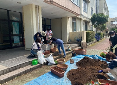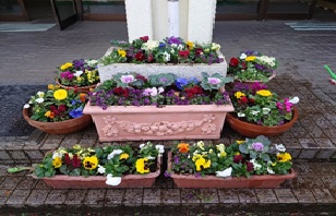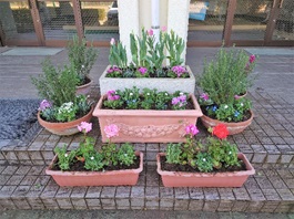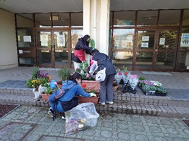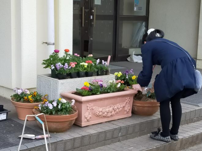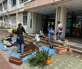 ・入学式を間近に控え、職員玄関、生徒昇降口等のお花の植え替えを行いました。