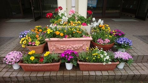 どりのお花が職員玄関、生徒昇降口等を飾っています。