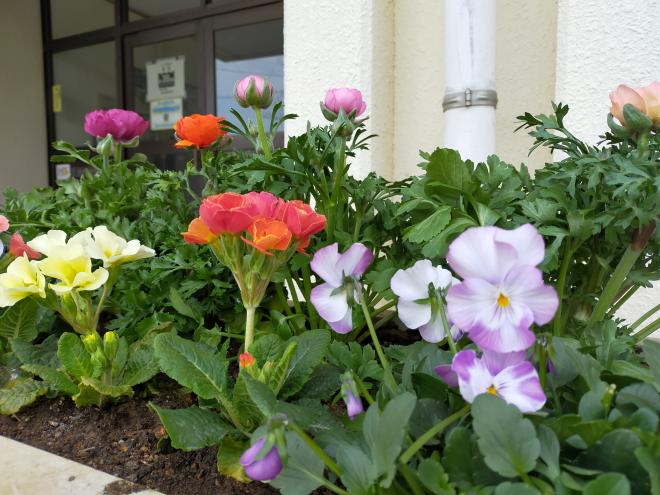 ・職員玄関、生徒昇降口等のお花を植え替えました。寒い冬の空気の中、鮮やかな色で校舎を