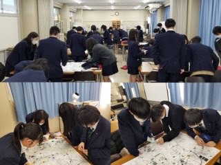 生徒は学校周辺の白地図を囲み、災害時の危険箇所や有用な施設等を探し、カラーペン等で色分けをしてオリジナルの地図を作成しました。また、作成した地図から、地域の安全度・危険度を話し合い、互いに災害想像力を養い合うことができました。