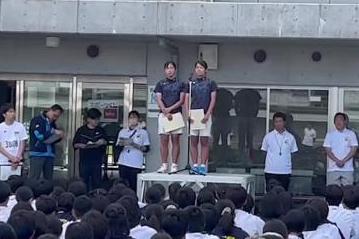 今年度は、ソフトテニス部3年森下芹羽・汐羽ペアの関東大会・インターハイ出場が決まりました。顧問の小山先生からの激励とともに、生徒からの割れんばかりの拍手を受け、試合にかける熱い思いを語ってくれました。本校生徒・教職員一同、彼女たちの健闘を祈っています。