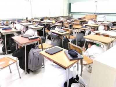 今日は6校時のLHRの時間に防災訓練を行いました。放送にて地震が発生した想定で、生徒は地震が収まるまで机の下に体を潜っていましたが、身の隠し方が見事でした。