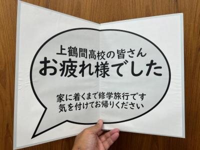 47 期生修学旅行も最終日、羽田空港までお迎えに行きました。到着時刻が30分近く遅れ、そうした状況も「まちコミ」でリアルタイムで保護者の皆様に伝えることができました。お迎えにこのようなプラカードを持って立っていましたが、一部の生徒が喜んでくれました。