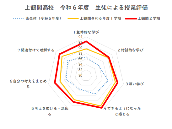 全項目で県全体の評価を大きく上回り、1学期よりも2学期で評価が高まっていることがわかりました。これからも引き続き授業改善を推進していきたいと思います。
