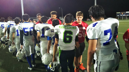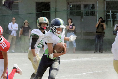 新人戦にて、合同チーム(上鶴間・浅野・白山・松陽)は横浜立野と対戦しました。第2Qに、上鶴間木村君のタッチダウンパスで得点した6点を守り切り勝利しました。応援ありがとうございました。