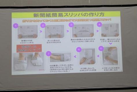| 新聞紙簡易スリッパの作り方 | 簡易スリッパ作成体験の様子 |