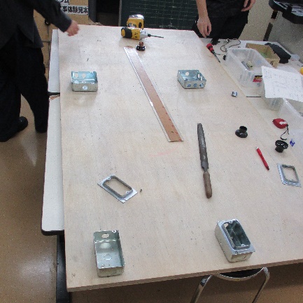 生徒たちは設計図に基づき、金属管、PF管、レセプタクルといった電気工事部材を時間内に正確に接続していきます。チームで協力し、複雑な配線作業を進める中で、互いに協力し合うことの重要性を学んでいました。