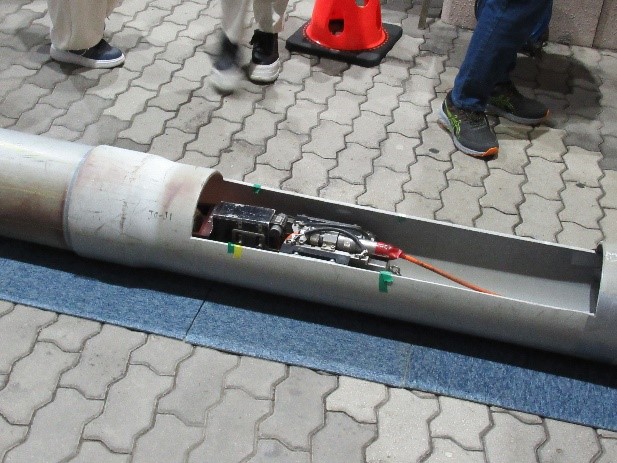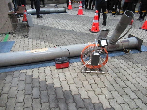 | ラジコン型のロボットカメラ | 模擬下水道管の様子 |