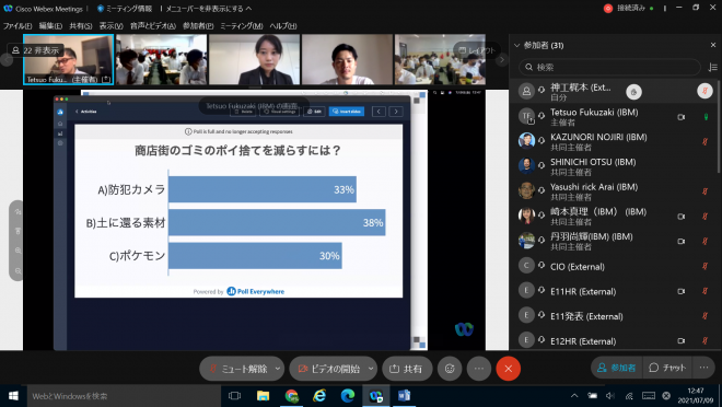 発表終了後、IBMより「企画局面の大切さとITがお仕事をお助けする事例紹介」が行われました。 クイズ形式で、生徒はスマホで回答を送信し、タイムリーに回答数を見ながら、事例を紹介の話を聞きました。 |