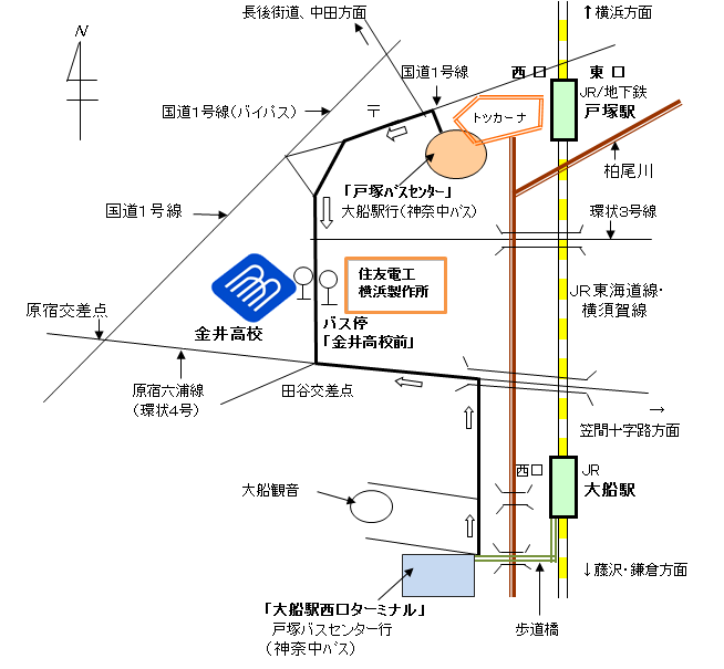 - トツカーナ隣接「戸塚バスセンター」7番乗り場にて、神奈中バス「大船駅西口(戸71.戸72)」行き,または「金井高校前(戸71.戸72)」行き乗車、約15分